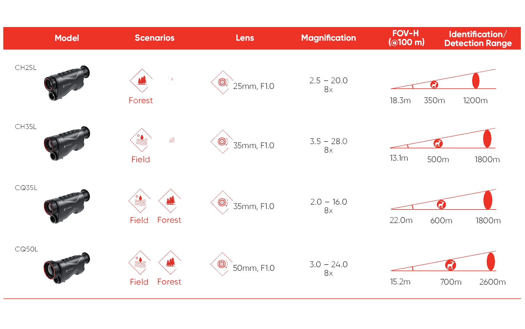 Monokular CQ35L umożliwia wybór spośród czterech trybów kolorystycznych, dopasowanych do warunków środowiskowych: